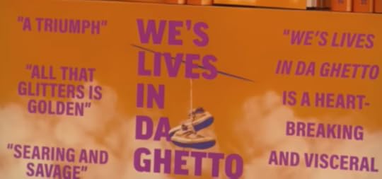 In the bookstore, Monk spots a display for a runaway bestseller titled 'We's Lives In Da Ghetto' by Juanita Mae Jenkins.