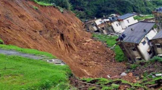 Relentless as a rushing river, the earth, mud, and rocks denude the hillside and force their way through a small croft, smashing windows and breaking down the door.