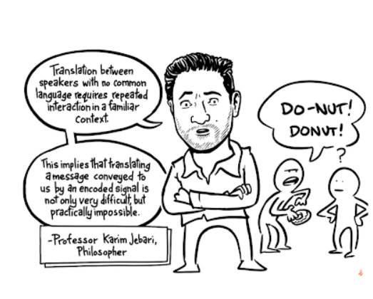 The authors note, "Alien language might employ not only unfamiliar words and sounds, but also lights, gestures, or smells - not to mention that the thoughts an alien language expresses may themselves be unfathomable."